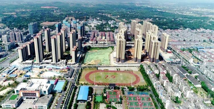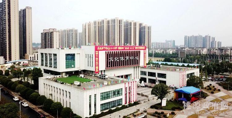 在县文体中心,人们悬挂巨幅横幅,庆祝中华人民共和国成立70周年。