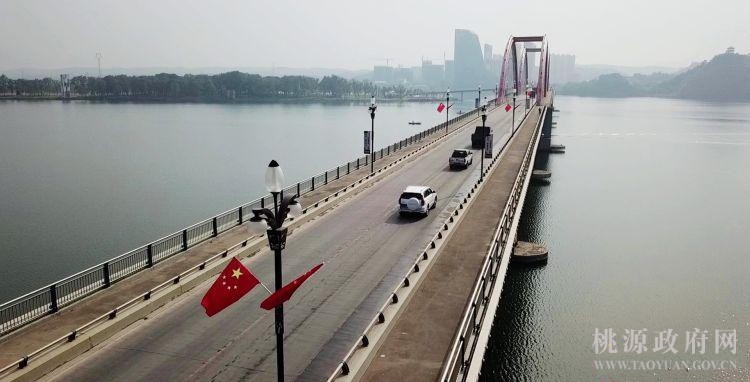 在沅水大桥桥头和桥上,庆祝中华人民共和国成立70周年主题造型展板、迎风飘扬的五星红旗,扮靓了桃城,洋溢着浓厚的节日氛围。