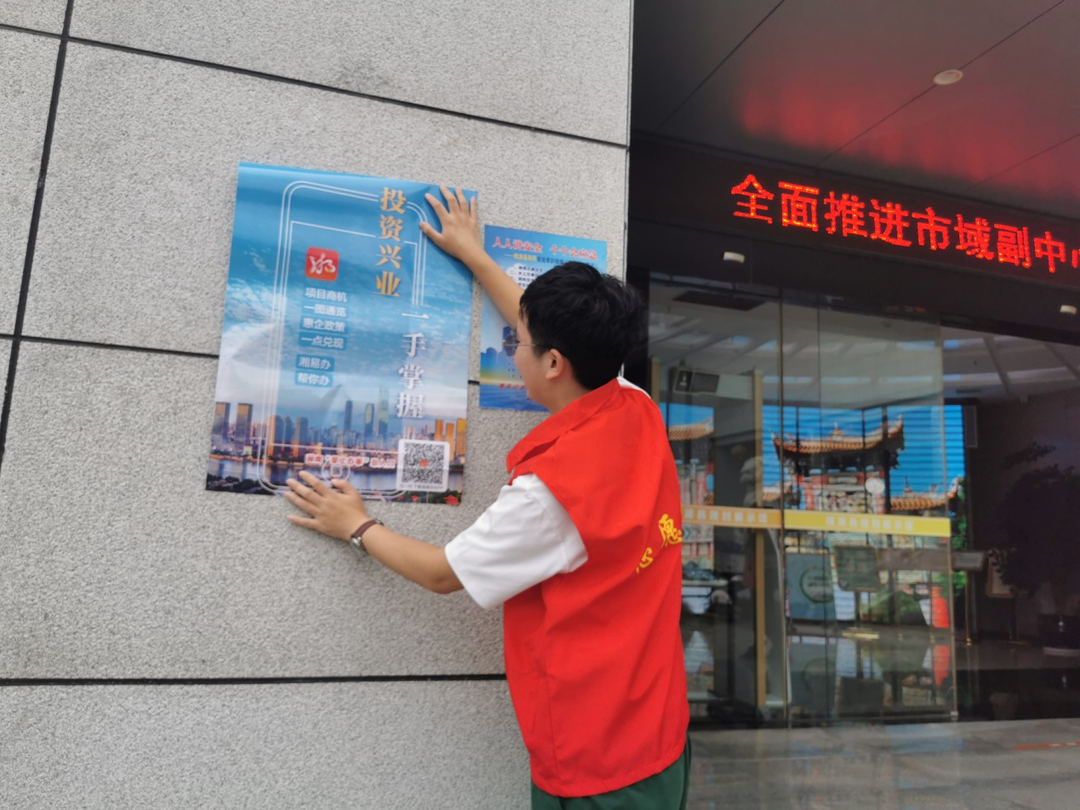 志愿者正在张贴宣传海报