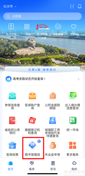 进入“湘易办”APP,在首页金刚区第二页,直接点击“图书馆借阅”功能,即可跳转至“湘阅通”微信小程序使用有关服务。