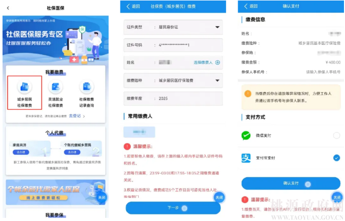 在“社保医保专区”进入城乡居民社保缴费服务页面,填写需缴费的参保人员信息,选择城乡居民医疗保险缴费险种,并选择2025年缴费年度。核对信息无误后点击“下一步”进行缴费,然后选择支付方式,点击“确认支付”进行缴费。