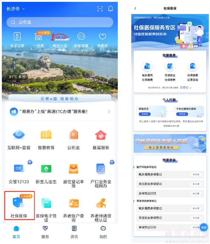 登录“湘易办”APP,或“湘易办”支付宝、微信小程序,点击首页金刚区“社保医保”,即可进入“社保医保专区”。