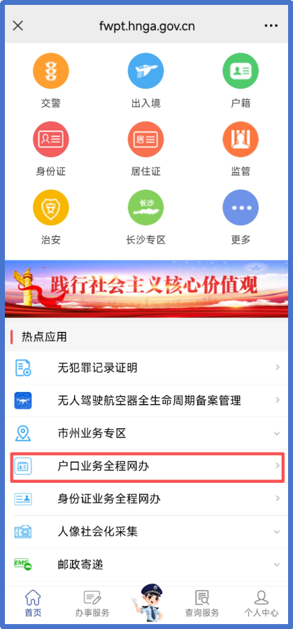 一、湘籍居民微信关注“湖南公安服务平台”公众号,注册并实人认证登录,点击“微警务”进入平台首页,在热点应用栏中选择“户口业务全程网办”;或者登录省政府“湘易办”APP首页,点击“户口业务”,进入湖南户政业务网上办理平台,在“我要办理”菜单中选择要申办的四项业务,填写相关信息,拍照上传证明材料,提交办件申请。