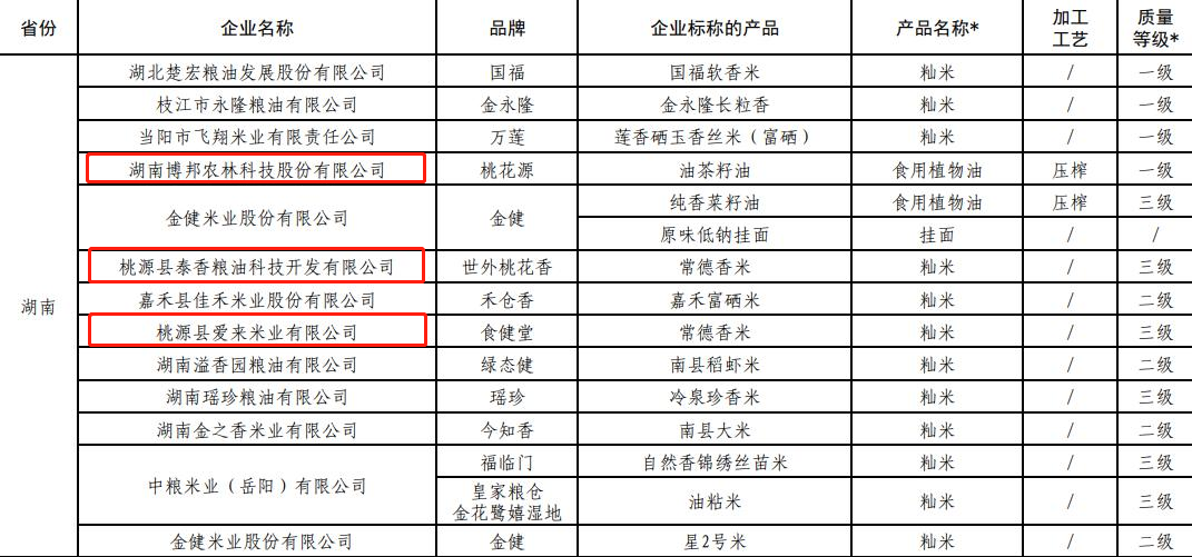 桃源县有3个粮油产品入选,包括2个大米、1个油茶籽油产品入选,即桃源县泰香粮油科技开发有限公司“世外桃花香”牌常德香米、桃源县爱来米业有限公司“食健堂”牌常德香米、湖南博邦农林科技股份有限公司“桃花源”牌油茶籽油。桃源县上榜企业数量占全省的1/4、上榜产品数量占全市的50%。