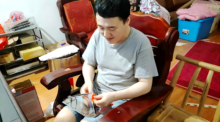 丈夫燕良涛居家帮助在制衣车间工作的易绮呈调试配件