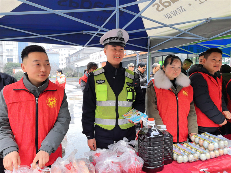 活动现场,热闹非凡。“大爱家庭农场”的农产品吸引了众多群众前来游览和购买。而更让人感到温暖的是,交警民辅警和志愿者们为群众送上了一份特别的礼物——张贴交通安全反光贴和交通安全手册。这些贴心的举措,不仅提高了群众的交通安全意识,也为他们的出行增添了一份保障。