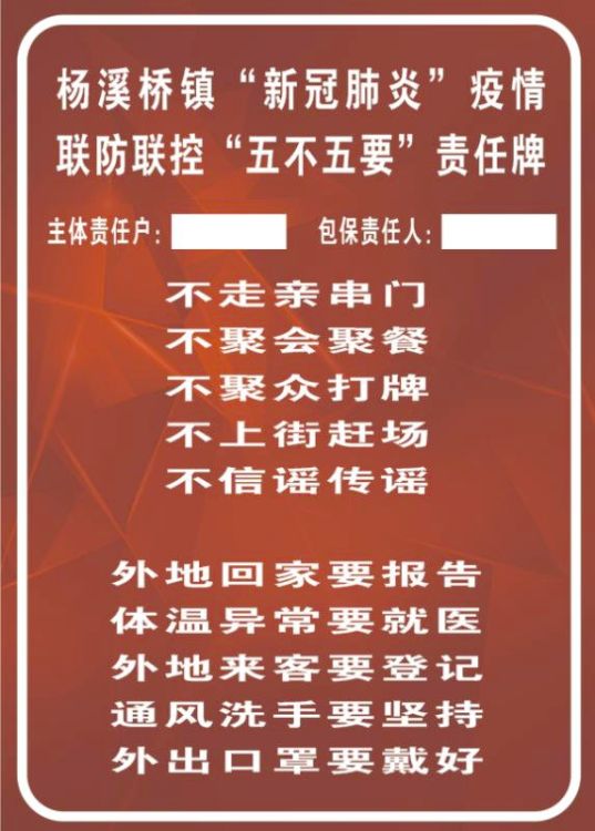 一张责任牌,上墙更上心。为全镇居民张贴疫情防控责任牌,以“五不”“五要”明确各家各户在疫情防控中的责任和防控措施,“五不”,即不走亲串门、不聚会聚餐、不聚众打牌、不上街赶场、不信谣传谣。“五要”,即外地回家要报告、体温异常要就医、外地来客要拒绝、通风洗手要坚持、外出口罩要戴好。号召全员上阵、全员坚守、全员配合,切实做到依靠群众、发动群众、群防群控。