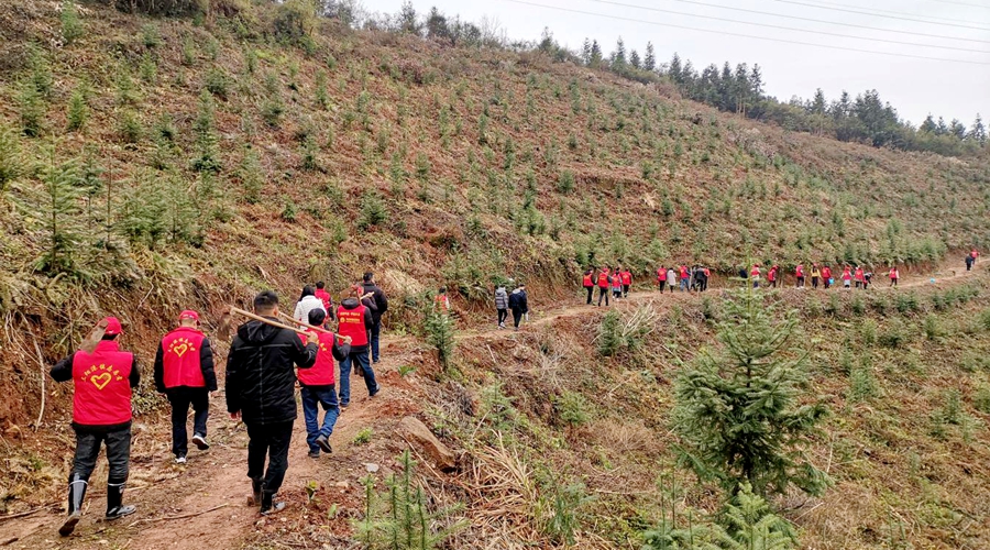上午8点半,身穿着红色马甲的志愿者们,有的扛锄头、有的抱树苗、有的提水桶,在林业技术指导员的指导下,大家分工合作,配合默契,有的挥锄挖土、有的扶树填土、有的提水浇灌,干得热火朝天,充分体现了团结、互助、友爱的精神。