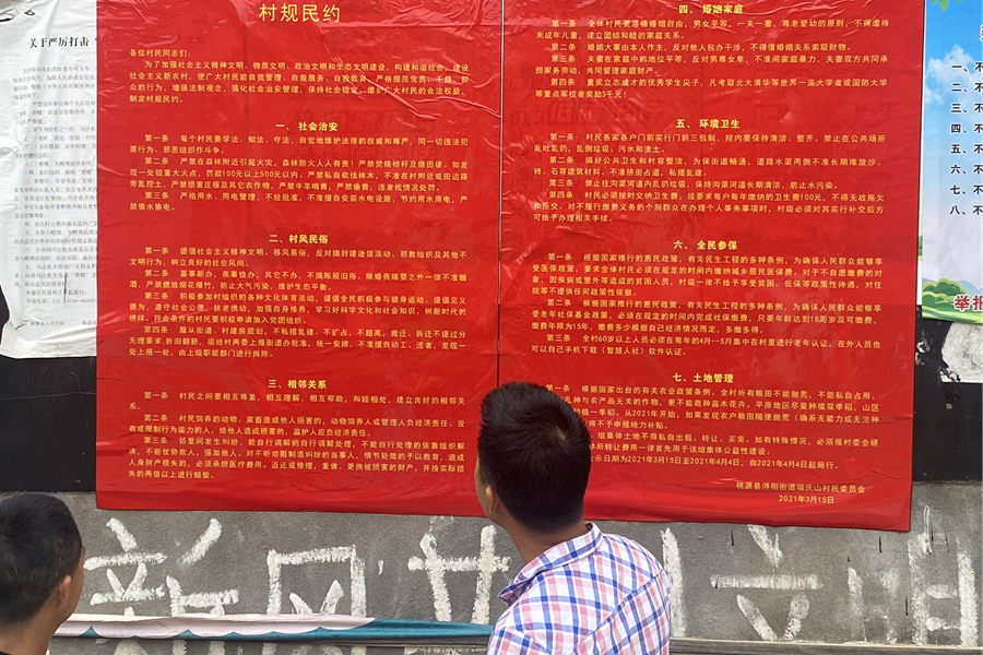 “换届选举后村里的村规民约还是原先的老版本。街道开会也提出了更换的要求,于是就督促村里进行了及时更换。”联系福庆山村的街道干部刘国栋介绍。