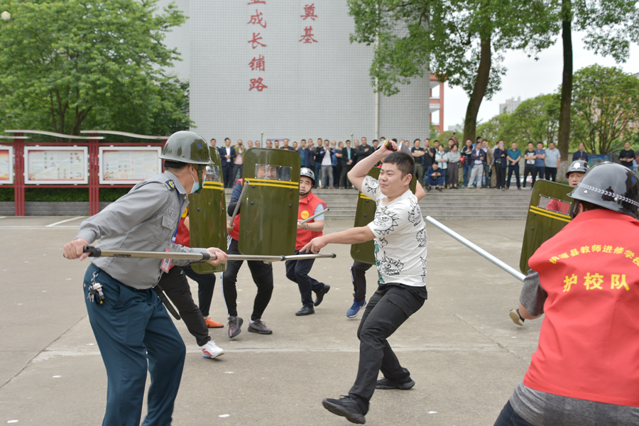 为开展此次模拟演练活动,漳江街道成立了演练指挥部,制定了详细周全的模拟演练方案。模拟演练中,学校值班室的安保人员发现一名持刀“暴恐分子”闯入校园后,快速对学校大门进行封锁并立即拉响警报铃,通知全体学生立即锁好教室门窗并躲藏在安全区域。全体安保人员、护校队员快速反应,迅速集结,一起阻止“暴恐分子”进入教学区域。在警方、防暴组成员共同努力下,“暴恐分子”被制服,受伤的安保人员得到及时医治。随后,根据演练情况,漳江街道工作人员向观摩演练的全县各中小学的安全负责人详细介绍了防暴器具的使用方法,以及在遇到类似突发事件时应该如何处置、躲避,以便将伤害降到最低。