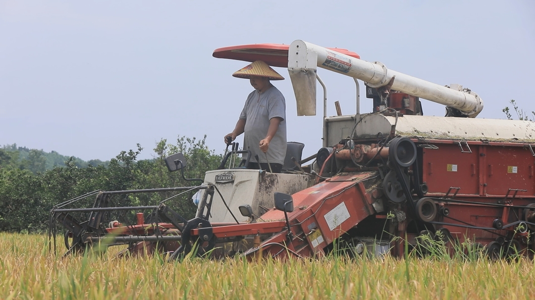 在双溪口镇先锋村,种粮大户曾少明正在马不停蹄地收割稻谷。金黄的稻田里,收割机来回几圈后,拖拉机的车厢就已被装载得满满当当。沿着机耕路一路前行,不用一刻钟,一车车沉甸甸的稻谷就可以直达烘干中心。