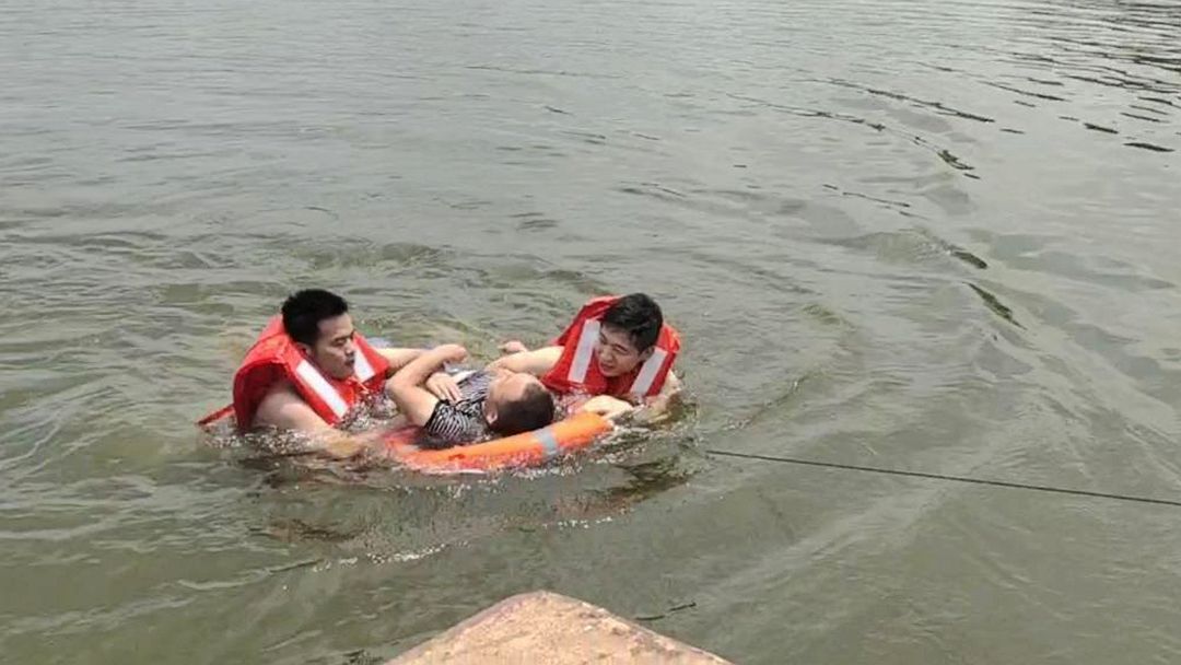 模拟演练开始,岸边响起“有人溺水,快救人”的呼救声,救援人员迅速赶到岸边,识别险情,发现溺水者尚在水面,且离岸边不远,立即将竹竿递给溺水者,等溺水者抓住竹竿后将其拖至岸边,成功救援。接着,又模拟演示了利用带绳的救生圈、救援船实施救援的情形和由救生员直接下水施救的情形,以及当落水者救助上岸后,发现其无自主呼、心跳停止时,医疗人员立即对落水者进行心肺复苏急救的情形。