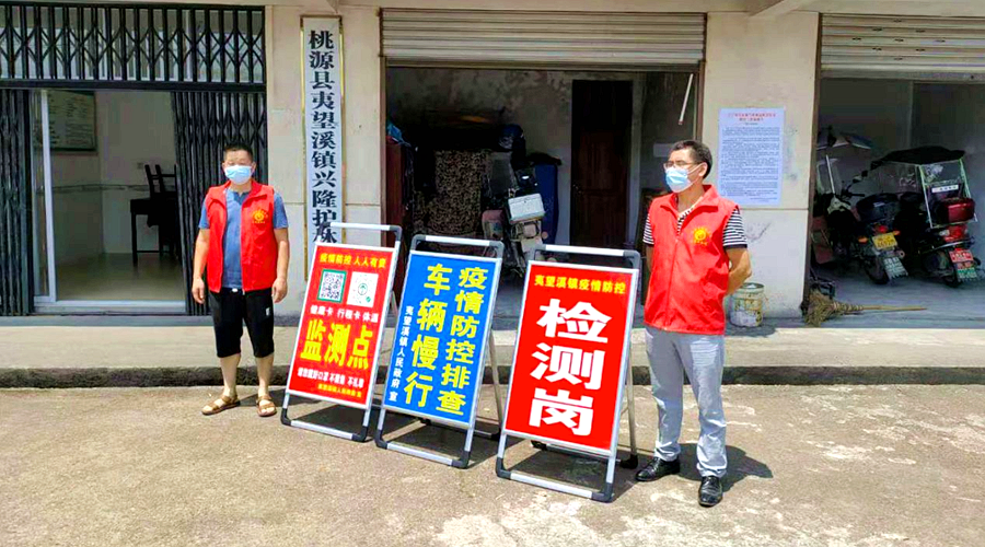 8月2日上午,桃源县夷望溪镇的疫情防控检测点,几个全身湿透了的身穿红马甲的工作人员,在炎炎烈日之下,手拿温度计和台账,对来往的车辆及人员一一进行着检查和登记,他们便是夷望溪镇退役军人志愿者和村居工作人员。