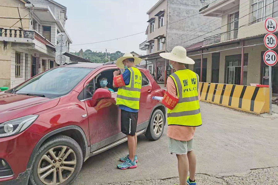 在检测点拦下过往车辆,查看口罩、健康码、行程码,测量体温,询问出行轨迹,登记信息,他的工作认真迅速。今年18岁的志愿者罗定邦表示,他今年报考的是湖南警察学院,能在这个暑假为家乡抗疫做点事情,他觉得非常有意义。
