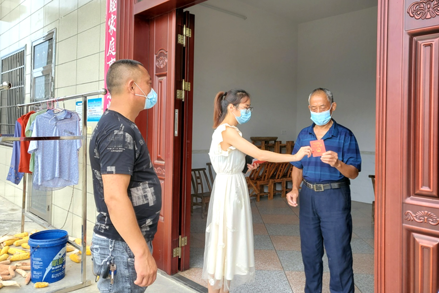 “郑叔,您前天打电话跟我说,想办一个老年证,今天我们给您送过来了,疫情期间,感谢您的配合,希望您还是尽量少出门,出门也一定要做好个人防护措施。”8月12日上午,高湖村治调主任郑桂华和政务专干雷雯淇来到65岁老人郑明伍家中,将之前“预约”办理的老年人优待证送到他手中。