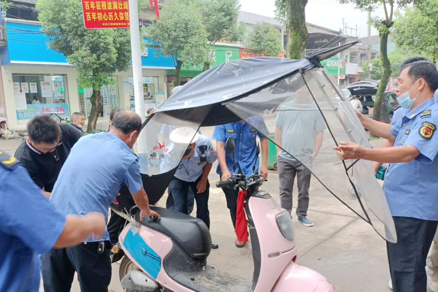 工作人员对电动车、摩托车违法加装的伞具进行就地拆除