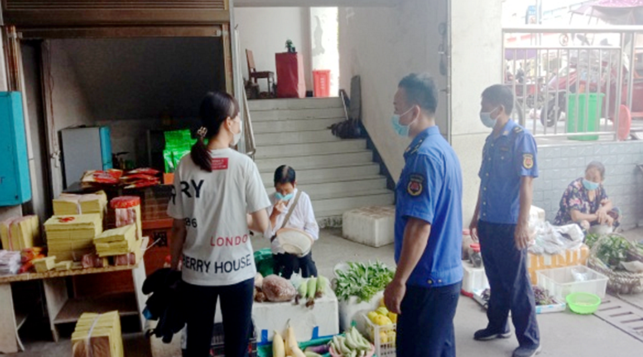 “请大家自觉戴好口罩,摆摊的老乡们千万不要越过线挡住人行道了,请大家自觉遵守。”8月31日早上六点多,城管队队长唐长春就像往常一样出现在农贸市场内,不厌其烦地提醒着农贸市场的每一个人。