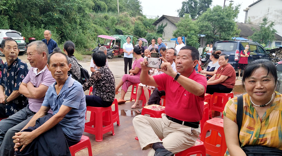 现场不少村民掏出手机,记录着精彩的场面,遇到熟悉的曲子还跟随唱上几句,过足戏瘾,老戏迷们还向大家介绍了自己看戏的经历和对汉剧的认知——“这个扮徐策的唱腔真好,是个角”“你们看,几个武将都打不过烧火丫鬟杨排风”“九溪的班子确实强,我做伢伢的时候就看他们的戏了”“这么热的天,演员们穿着厚重的戏服给我们唱戏,真的是辛苦了”……