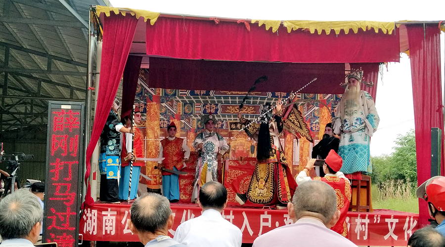 承接我镇送演任务的桃源县九溪汉剧团历史悠久、实力不俗,在市、县大型竞赛展演中屡获殊荣,演出足迹遍布常德、桃源、汉寿、兹利、石门等多个区县市,还曾多次赴省演出、获奖。演出现场,他们拿出看家本领,冒着30多度的高温,激情满满地为四地观众分别送上了《薛刚反唐》《金光阵》《五马跑朝》《御花园比武》等四部脍炙人口的传统汉剧曲目,演员们的一颦一笑、一俯一仰,都吸引着观众的目光,抑扬顿挫的伴奏、悠扬绕梁的唱腔让人听得入迷,娇俏的花旦、滑稽的丑角、俊朗的小生、逼真的打斗、婀娜多姿的身段令人大饱眼福。
