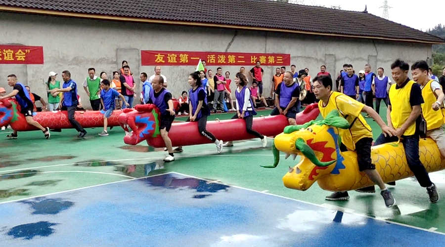趣味运动联谊会现场,乡村两级的干部们以队伍为单位进行了“龙行天下”、同心鼓、不倒森林、集体跳绳、三方拔河五个项目的比赛。大家互勉互励、氛围融洽,比速度、比技巧、比风貌。从运动会开始到结束,赛场上加油声、呐喊声、喝彩声此起彼伏,好不热闹。