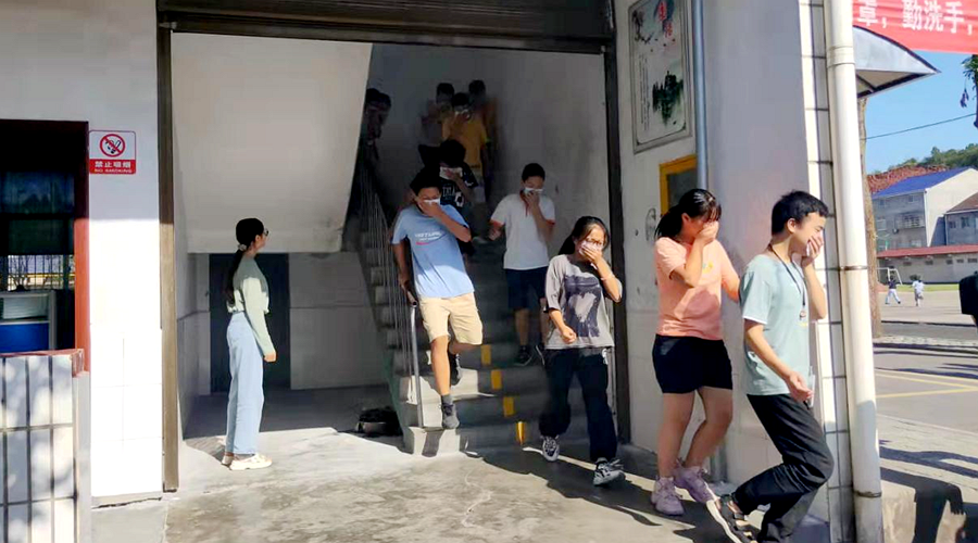 随着消防警报的响起,还在教室上课的学生们在老师的指导下,按照应急预案,纷纷用手帕捂住嘴,弯着腰,沿着学校指定楼梯通道快速、有序地撤离到学校操场的安全地带。