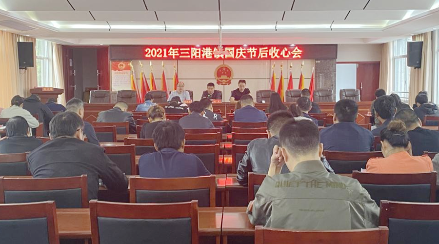 10月8日,为使干部职工从节日的轻松氛围中迅速收心归位,三阳港镇召开全体干部职工国庆节后收心会,总结当前干部作风状态和国庆期间各项工作,安排部署疫苗接种及疫情防控、安全生产、乡村振兴、党风廉政、环境保护等重点工作。