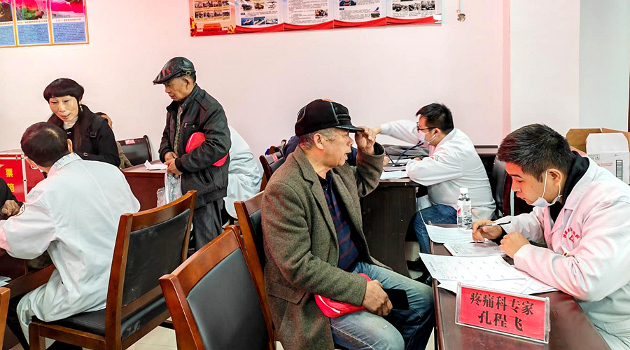 义诊现场,医护人员为退役军人量血压、测血糖,检查身体状况,对常见病、慢性病等进行初步筛查和诊断,针对他们的身体状况给予合理的健康调理建议,耐心地解答他们的咨询,同时向他们发放卫生健康服务手册,并针对具体情况免费发放常用药物。
