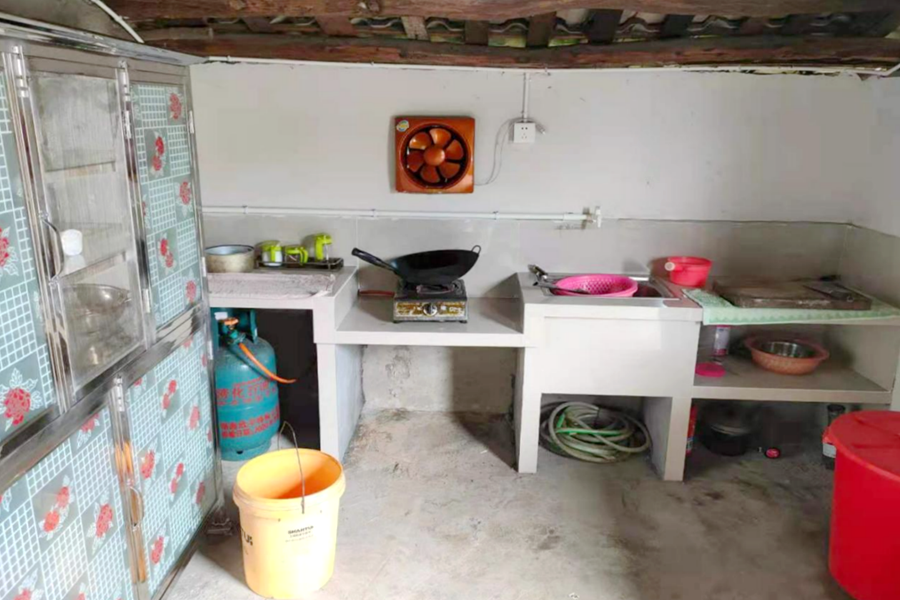 刘代红家原来的厨房里只有一个一米宽的水泥台子,上面放着液化气灶,一个简易木桌已摇摇欲坠,厨具也是随意摆放。没有抽油烟机,做饭时油烟四处飘散,墙体长期受油烟污染,已看不出本来颜色。