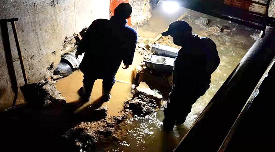 镇水利办罗敏浩及维修工作人员立即前来现场进行修理。经仔细检查,漏水原因为热胀冷缩导致输水管接口处松动。为了不影响居民正常生活,工作人员选择在凌晨1点对输水管进行检修,他们俯下身子,弯着腿,走进渠湾内加固接口。历经3个小时的全力抢修,输水管终于恢复供水。