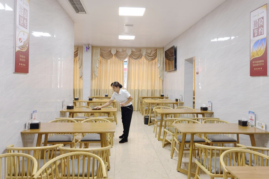 工作人员对食堂餐厅进行“地毯式”清洁消毒