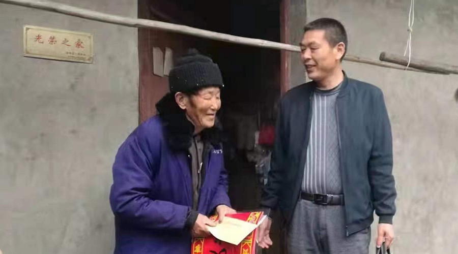在抗美援朝老复员军人余海华家中,退役军人服务站负责人询问他的身体状况和在生活中的困难和问题,并将慰问金和春联发放到他的手中。已经93岁高龄的余爹十分感动。他说:“现在国家强大了,但从来没有忘记过我们这些军人,每年都有慰问,心里感觉很温暖。”