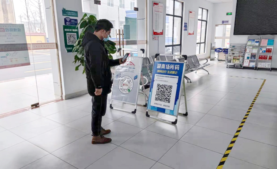 枫树维回乡重点场所进来人员正在扫描湖南省居民健康码场所标识码