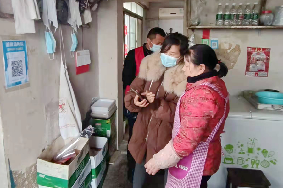 (浔阳街道纪工委副书记周红丽推广场所码,劝导群众佩戴口罩)