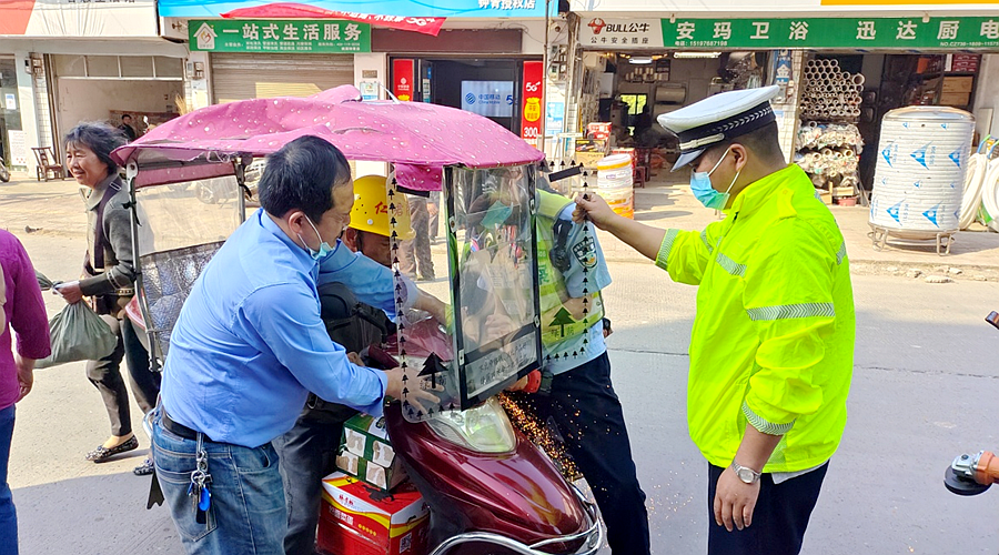整治行动中,执法人员在辖区重要交通路段、乡村道路出入口等地,以逢车必查、劝导为先为出发点,抓住交通顽瘴痼疾“病根”,针对集镇摩托车、电动自行车不按规定佩戴安全头盔、安装遮阳伞、乘用车超员、无牌无证驾驶等违法行为进行严肃执法。其中,对骑摩托车未戴头盔和乱停乱放的车辆驾驶员进行了劝导与批评教育,引导群众自觉遵守道路交通规则,提高思想认识、守住思想红线,做守规矩、讲文明、明底线的新时代好公民。同时加强对“一盔一带”的宣传引导,向摩托车、电动车驾乘人员宣传佩戴头盔的重要性,讲解安装伞棚的危害性,采取教育、警告、罚款、曝光手段,形成处罚一例、教育一片的整治效果。
