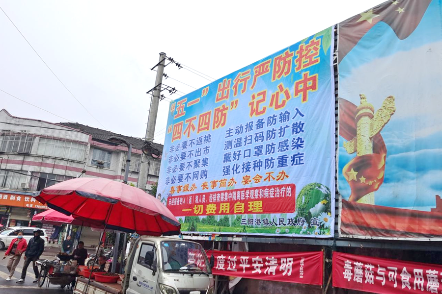 盯紧“健康上”的安全。疫情防控不放松,继续筑牢“防疫墙”。五一小长假人员流动较大,三阳港镇干部职工扎实做好疫情防控值班值守,从严从紧从细从实落实疫情防控各项措施,各村(居)加大自主摸排力度,及时上报、加强管控,劝导大家“四不四防”记心中,倡导“喜事缓办、丧事简办、宴会不办”,营造良好的疫情防控氛围。