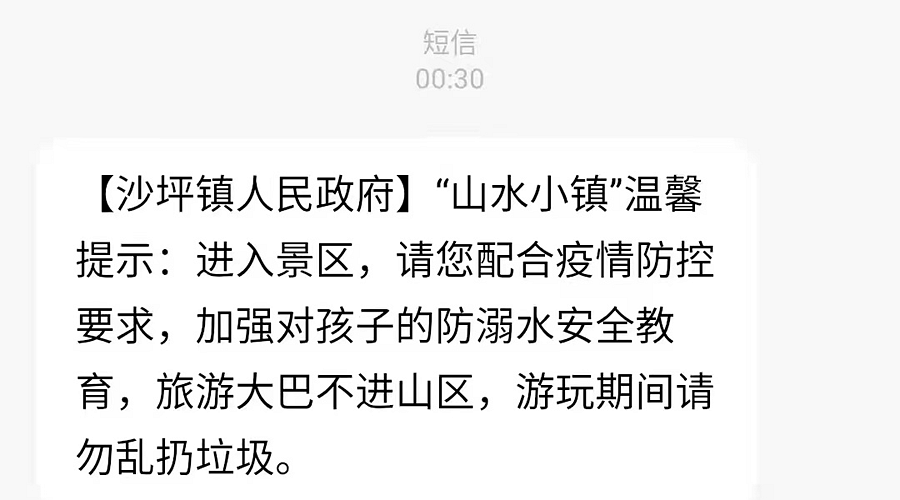 结合短信推送,精准提醒到人。自5月1日起,进入沙坪镇辖区内的游客会收到来自沙坪镇人民政府的一条短信:“山水小镇”温馨提示,进入景区,请您配合疫情防控要求,加强对孩子的防溺水安全教育,旅游大巴不进山区,游玩期间请勿乱扔垃圾。据悉,该镇政府通过与通信运营商合作,开通短信提醒服务,切实增强广大居民与游客的安全防范意识。