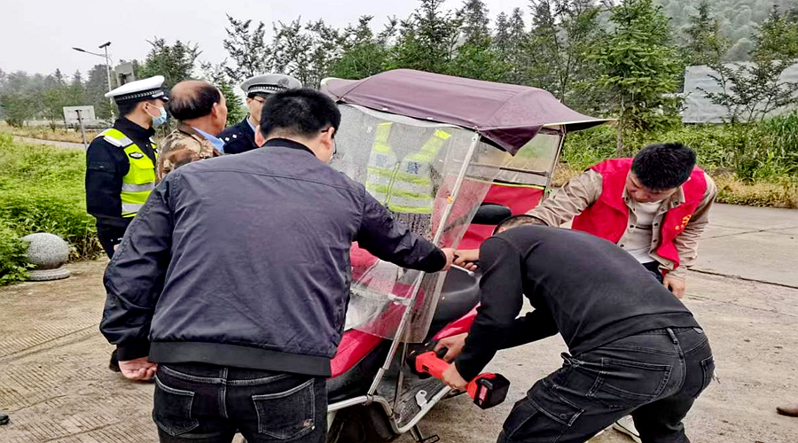 “师傅,你戴了头盔,证明你有很强的安全意识,但是摩托车、电动车不能加装遮雨棚,这种行为具有很大的交通安全隐患,一是影响阻碍视线;二是车辆重心发生改变,不稳定,容易造成车辆侧翻,导致发生交通事故,给你带来重大危害”执法人员耐心引导和教导问题摩托车辆的车主。
