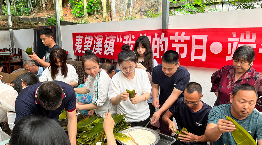 包粽子,包进和谐邻里情,包出美好新乡村。仙人溪村在镇党委政府的支持下开展端午包粽子活动,村民们齐聚在村委会大院里,大家有说有笑,其乐融融。乡风文明建立的基础、村规明约发挥效用的关键在于人与人之间的情感联系,而村民间的感情就在这棕叶的一折一裹之间热络起来,向心力也在捆绳系绳的动作中逐渐凝聚。建设美丽新乡村的祝愿被包进一个个粽子里,上锅一蒸,粽叶的清香便随着文明乡风吹进夷望溪镇的千家万户里、漫山遍野中。