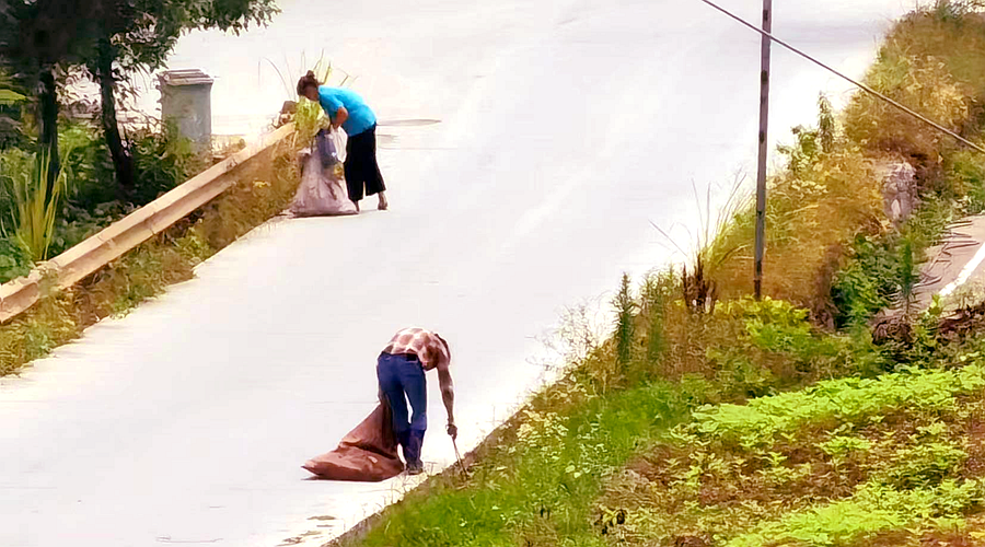 “哎,老李!你们又在做志愿者捡垃圾呀!这天气太热了,快来我家喝杯茶凉快凉快!”村民黄奶奶招呼道。