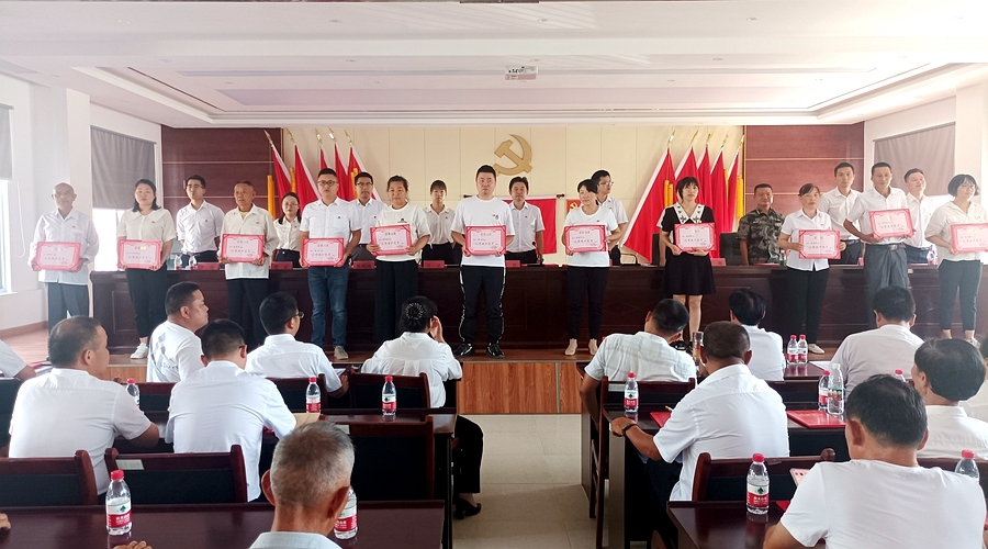 会议中,全体党员干部奏唱国歌,党委委员、组织委员翦红同志带领全体党员重温入党誓词,党委委员、党委副书记肖灵同志宣读表彰通报,理公港镇全体班子成员为理公港镇优秀共产党员、优秀党务工作者、先进党组织进行颁发奖牌、证书。