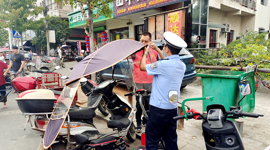 一是严查处。在主要交通路口开展路检路查,对摩托车和电动自行车违规加装遮阳伞、违法停车、违法载人、不按规定佩戴安全头盔等交通违法行为进行查处,并对其严肃批评教育,劝导群众安全出行,遵守交通规则。二是强宣传。通过线上线下相结合,充分利用LED、应急广播常态化播放50余次,覆盖群众3000余人次,发放宣传资料5000余份,张贴宣传海报500余张,营造遵守交通法规的良好氛围。三是重引导。充分发挥党员、志愿者的积极作用,加大对两轮摩托车、电动自行车的检查劝导,引导群众安全出行。