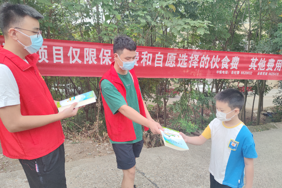 科协志愿者为学生发放《科普知识读本》