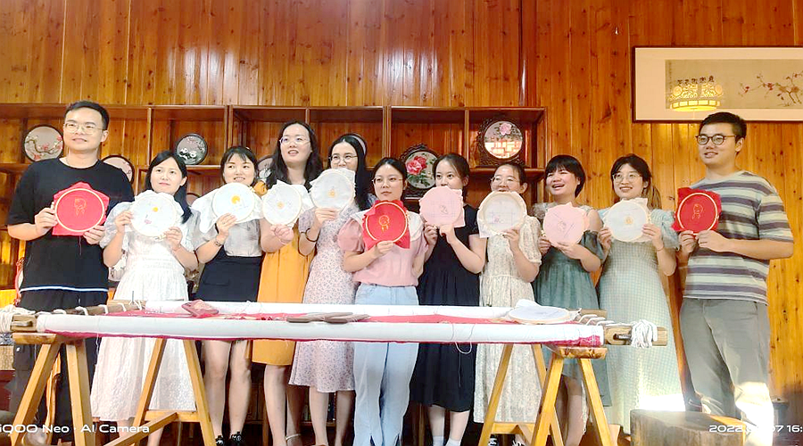 活动当天,郑家驿镇干部职工走进了齐绘绣庄。在这里,大家惊叹于一件件精美又深赋寓意的绣品,在绣房和绣品展示房久久停留,不愿离去。随后,在桃绣老师的指导下,全体干部职工体验了桃源刺绣,亲手将中秋的浓浓情意和美好的祝愿绣在了绣布上。