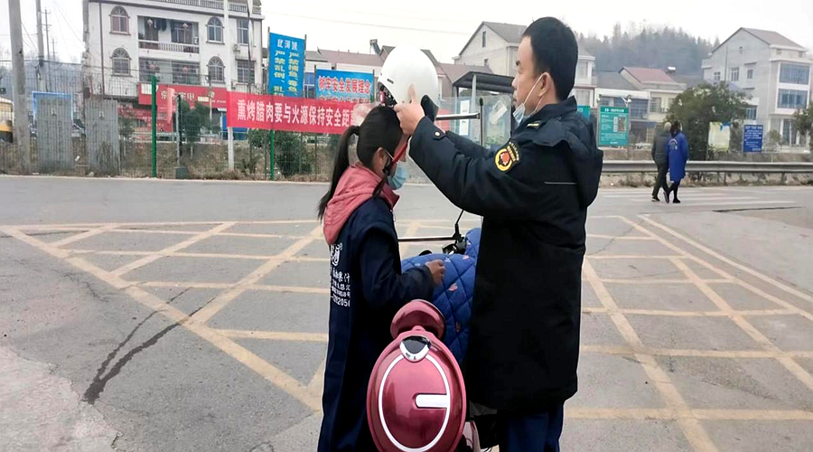 执法人员为群众送上“安全”帽