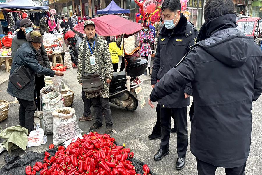 “大爷,你把菜摆在大马路边上占道了,过年人多车多,交通也比之前拥挤,咱们摆到里面去点,您自己也安全些。”执法人员劝解道。在整治过程中,执法人员重点对农贸市场、十字路口、镇卫生院等车流量大的区域进行管控。对店外经营、流动商贩随意摆摊,乱扔垃圾等现象开展集中整治,以边劝导、边宣传等方式教育引导商贩规范经营秩序,有效消除“马路市场”,解决集市环境问题并消除安全隐患。