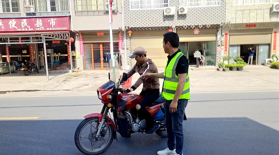 长潭坪社区对未戴头盔的居民进行交通劝导