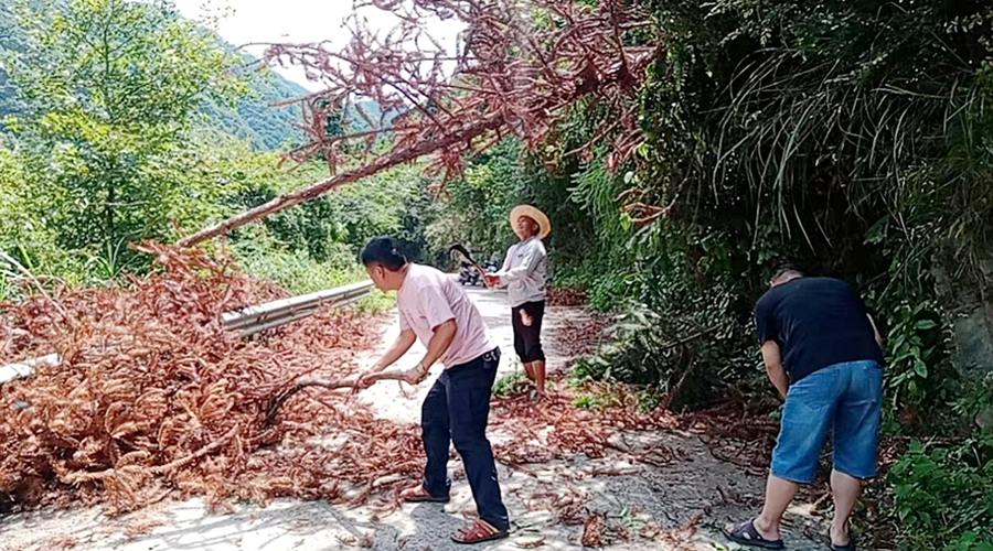 志愿者在观音寺镇万阳山村主干道清理路障
