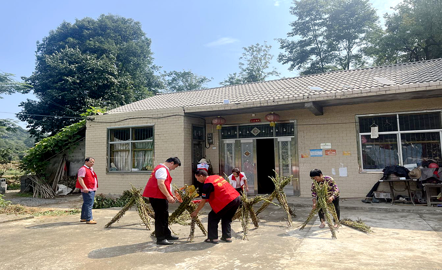 黄石镇大谷村片长和邻长,为村民抢收芝麻并绑扎晾晒