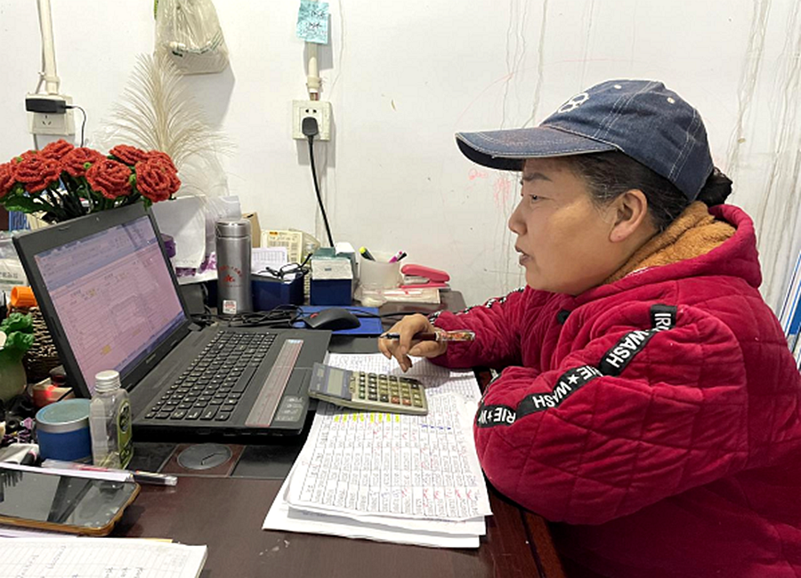 邓春霞在工位上计算工厂账目