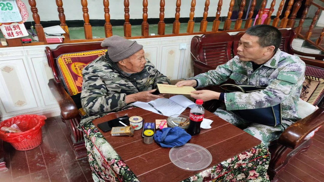 在抗美援朝老兵朱龙生家中,工作人员与其亲切交谈,认真聆听老人参加抗美援朝的战斗故事,详细了解他的身体和生活状况,感谢他为国家和人民作出的重大贡献,并送上慰问金和台历。工作人员一再叮嘱老人要保重身体,有困难及时向镇退役军人服务站反映,党和政府一定会全力帮助解决。临别之际,老同志激动地说:“谢谢党和政府的关心,还有这么多人过年看望我、记得我,感谢、感谢……”